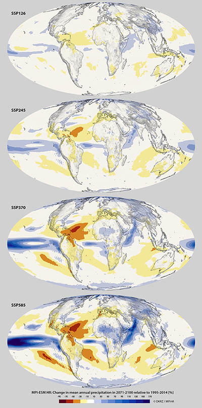 Precipitation changes for the 4 scenarios with MPI-ESM HRFigure 1: MPI-ESM HR: Mean annual precipitation change in percenthttps://www.dkrz.de/bilder/bilder-cmip6/precipitation-changes-for-the-4-scenarios-with-mpi-esm-hr/viewhttps://www.dkrz.de/bilder/bilder-cmip6/precipitation-changes-for-the-4-scenarios-with-mpi-esm-hr/@@images/image-1200-c8c24a6fef42b99eefb454e5471d5cc5.jpeg