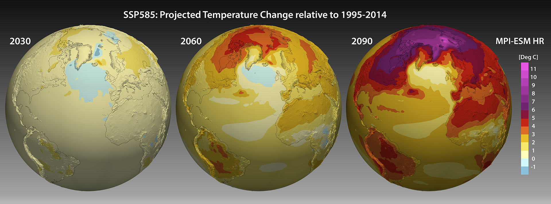 Simulated development of the temperature change for SSP585Figure 1: Change in 2m temperature for the rather pessimistic scenario SSP585 as simulated by the model MPI-ESM HR. The three globes show the warming pattern (annual mean) for the years 2030, 2060 und 2090 compared to the “current” situation (1995-2014).https://www.dkrz.de/bilder/bilder-cmip6/simulated-development-of-the-temperature-change-for-ssp585/viewhttps://www.dkrz.de/bilder/bilder-cmip6/simulated-development-of-the-temperature-change-for-ssp585/@@images/image-1200-c8c24a6fef42b99eefb454e5471d5cc5.jpeg