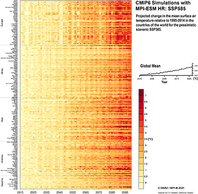 Temperature changes for SSP585 in the countries of the world Figure 2: Mean temperature changes for the 195 states of the world for the pessimistic SSP585 scenario as simulated by MPI-ESM HR. The more intense the shade of red, the stronger the climate change towards the end of the century.https://www.dkrz.de/bilder/bilder-cmip6/temperature-changes-for-ssp585-in-the-195-countries/viewhttps://www.dkrz.de/bilder/bilder-cmip6/temperature-changes-for-ssp585-in-the-195-countries/@@images/image-1200-c8c24a6fef42b99eefb454e5471d5cc5.jpeg