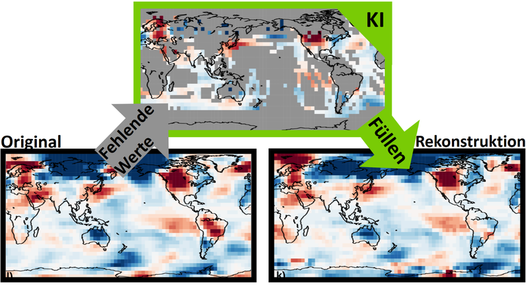 In Kooperation mit NVIDIA und der Freien Universität Berlin wurde in der neuen KI/ML-Gruppe am DKRZ eine KI-Technologie samt CUDA beschleunigtem faltendem neuronales Netz entwickelt, die mittels Training von Klimamodelldaten in der Lage ist fehlende Werte in z.B. Beobachtungen zu rekonstruieren.
