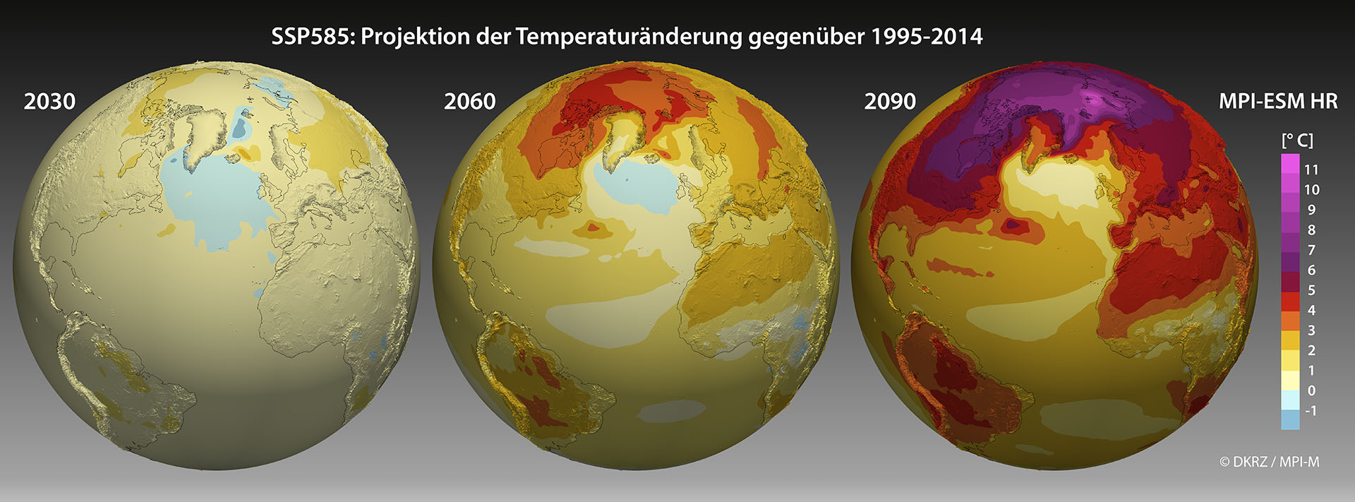 The video clip below shows a direct comparison of the temperature change simulated with MPI-ESM HR for the scenarios SSP126 (left-hand side) and SSP585 (right-hand side). For the optimistic scenario SSP126, warming compared to the period 1995-2014 is a bit below one degree in the global mean; accordingly, there are large bright yellow areas (less than one degree of warming) towards the end of the animation, but also – especially in high latitudes – areas showing significantly stronger warming. For the rather pessimistic scenario SSP585, the overall warming is markedly stronger; especially this scenario shows a pronounced contrast between land and oceans. Here the most intense warming (of more than 10 degrees C) occurs in the northern Polar Regions.