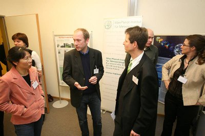 Senatorin Gundelach im Gespräch mit der Unipräsidentin Prof. Gabriele Löschper, Prof. Marotzke vom MPI-M und dem ehem. DKRZ-Geschäftsführer Manfred Meinecke